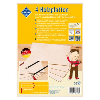 Pebaro 4 Platen Hout + Zaagjes voor de figuurzaag. Dit product wordt vaak gekocht in combinatie met de figuurzaag. Zo is het echt een compleet pakket en kunnen de kindjes er meteen mee aan de gang.